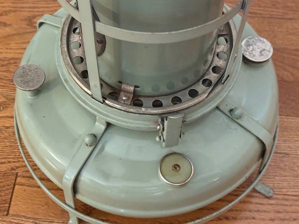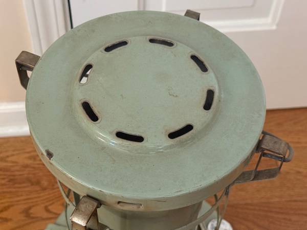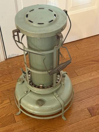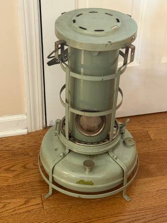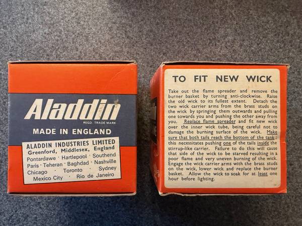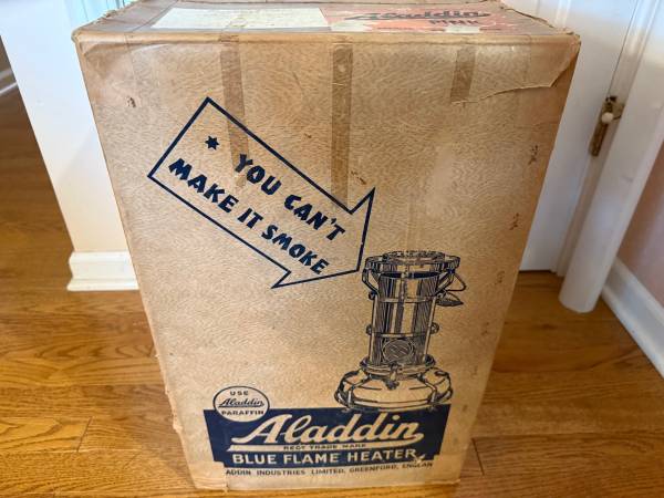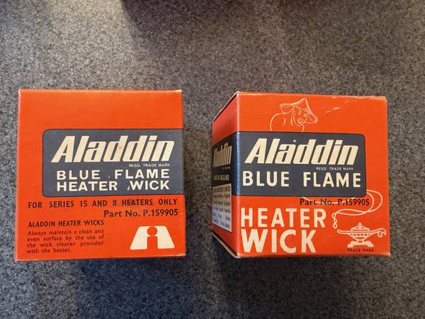 For Sale - Two (2) Vintage Aladdin Blue Flame Kerosene Heaters in nice condition. Both are original British production and both are the same model. Each has a wick installed and includes a spare new- in-box wick and a wick trimmer. One of the heaters also includes the original box it came in. The heaters are approximately 22” high and have a heavy-duty handle to easily move to a different location.