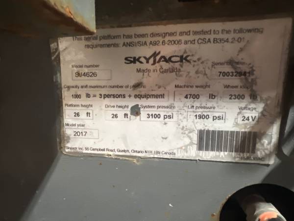 2017 Skyjack SJ4626 in very good condition!!! Available now in Addison!! It has NEW BATTERIES, NEW TIRES, NEW CHARGER, NEW DECALS!!!!!! Ready to ship!! Job ready!! Stop paying rent and call George!