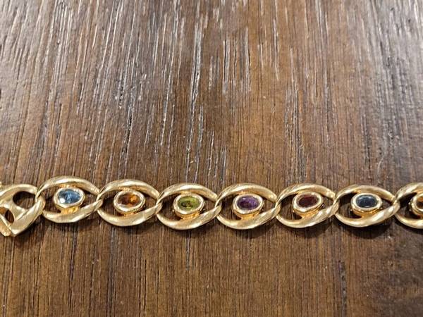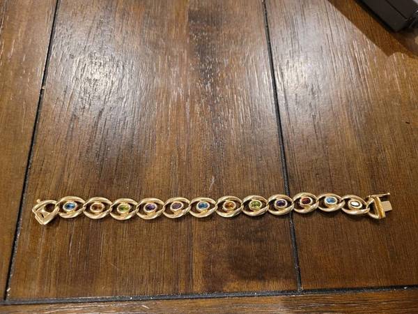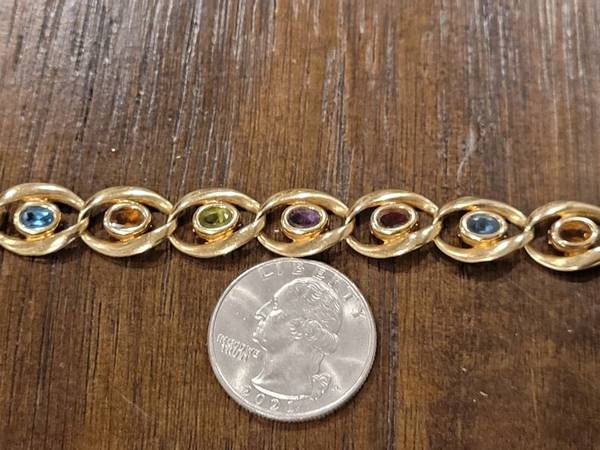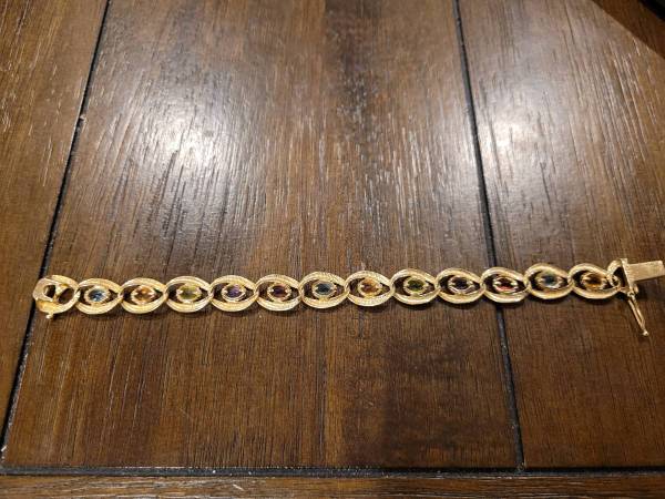 Fresh Estate Find! Vintage 14K Yellow Gold and Colored Stone Bracelet. Stamped 14k. One of the nicest pieces we have in inventory! Approximately 7 inches long from clasp to bail (approximately 6.75 in cuff size). Also includes safety clasp. Includes 12 total gem stones. I believe them to include Topaz, Citrine, Peridot, Amethyst, and Garnet. Total weight is a whopping 16.9 Grams. Superb, heirloom quality, fine jewelry piece- the pictures don't even do it justice! Overall, Excellent Condition. Asking $1500 obo! $25 Insured priority mail shipping or free pick up in Pingree Grove, Sublette, or DeKalb IL.
