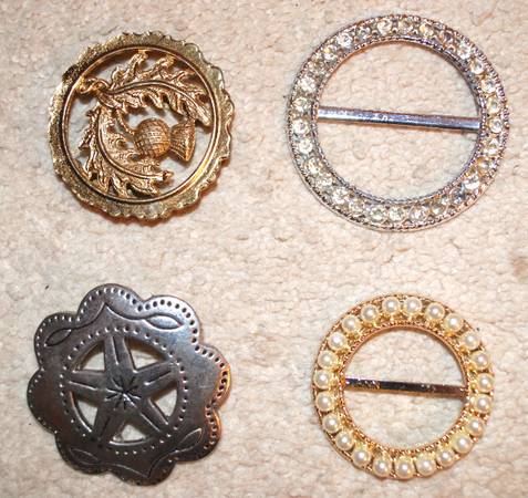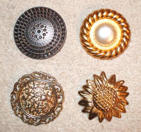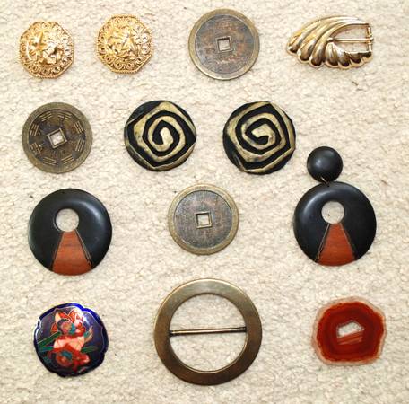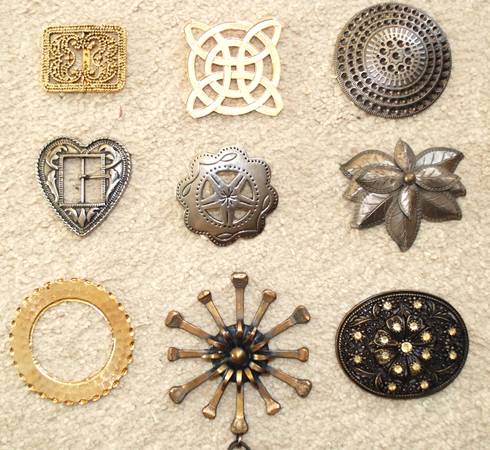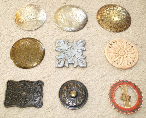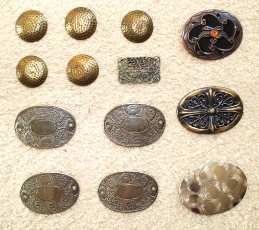 Over 75, made of brass, copper, iron, metal, wood and more. All sizes & shapes, typical "buckle" size.