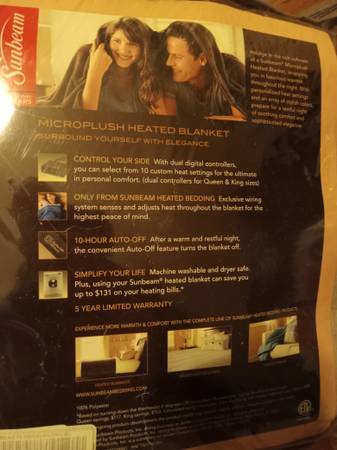 COLDER WEATHER HAS RETURNED... For sale is are a tan or beige color luxurious ultra soft Sunbeam Full size micro plush heating blanket. They have never been used and are in excellent condition. They have ten heat settings, a ten hour auto shutoff and a dual digital controller. It will not be needed due to change of bed size. Think it was purchased possibly at Meijer but not sure, nor the price. I think it regularly sells for 120.00 plus tax at target (now on sale for $100.00 plus tax) and we are selling ours for $50.00, reduced from $70.00. I will have access to electric to show that it works.