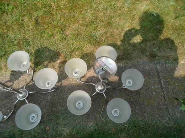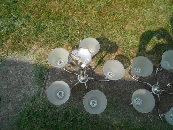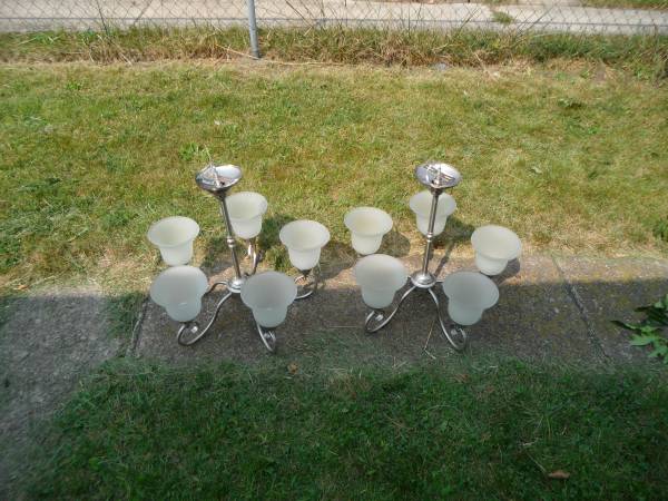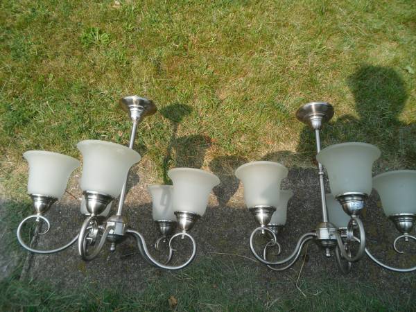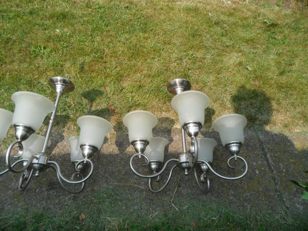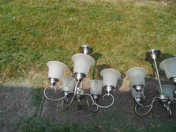 this is a pair of pre-owned Intertek 5 light chrome chandelier light fixtures with white glass shades, number 4004488, they are 20" tall and 22" wide (across from edge of shade to edge of shade. they are in good condition, NO BULBS INCLUDED. Please send your number along with any questions you may have and I'll get back to you as soon as I can.