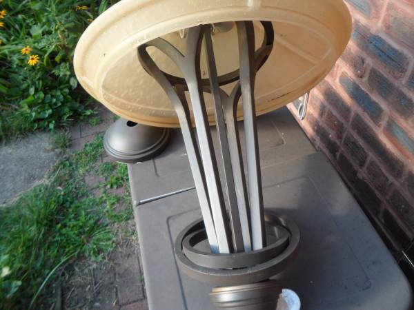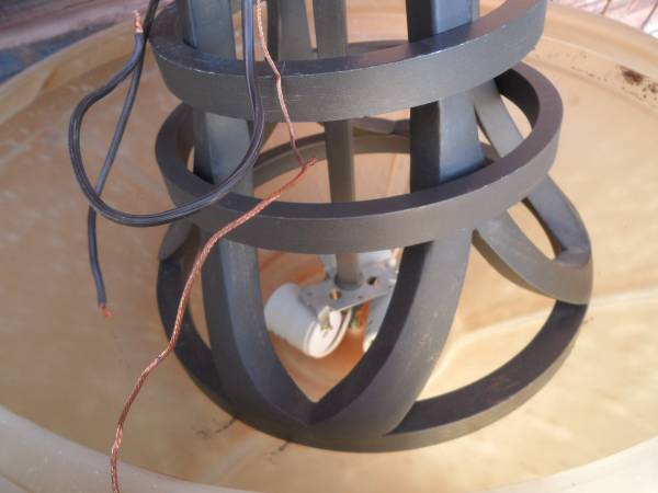 This is a pre-owned large hanging light fixture with a 18" glass shade with buff color with white swirls on a part brass part metal frame for an over-all length of 30".It is fairly heavy especially the glass shade. Perfect for a replacement shade. It is in good condition and seems to be complete but I'm not sure how the parts fit together. Please send your number along with any questions you may have and I'll get back to you as soon as I can.