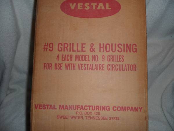 This is a Vestal #9 grille & housing for use with Vestalaire circulator. Housing is 7 5/8" x 7 5/8" x 3" deep and is 9" with the lip. The grille is white and is 9" x 9". It is brand new in the box.Vestal is a major maker of fire place accessories, This item may have other uses. They come 4 units to a box so I will sell for $3.00 each or $10.00 for a box of 4. I have 6 boxes for a total of 24 units. Please send your number along with any questions you may have and I.ll get back to you as soon as I can.