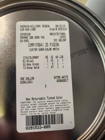 2-Gallons of Paint For Sale Never Used 2-Different Colors - One gallon each color Top Quality SW Paint Each sells for $80 Retail The two Colors 1-gallon Pigeon #25 Farrow & Ball Color 1-gallon...