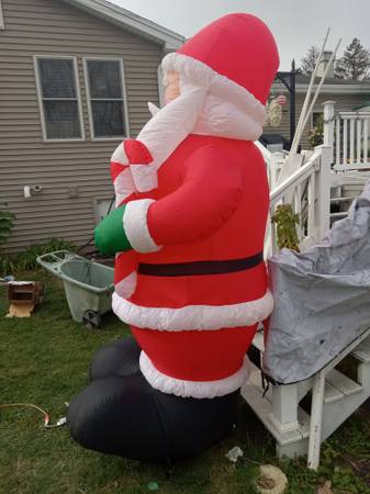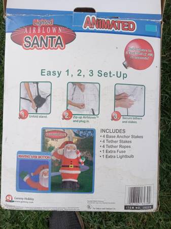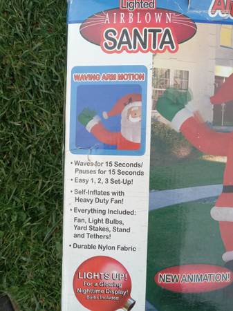 For sale is a 8' high lighted Santa inflatable holiday decoration with moving arm. It was only set up one time and is in excellent condition but unsure if small stakes (easily substituted) are with it. Selling it for $45.00, reduced from $50.00.