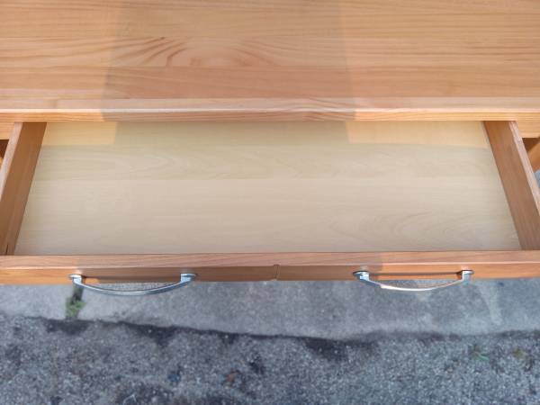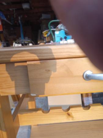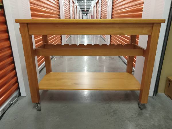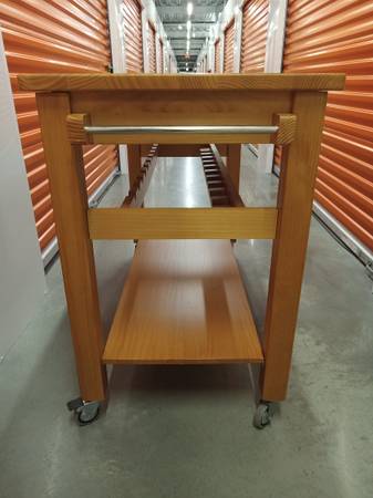 For sale is a just assembled Linon rolling kitchen cart. It was purchased for my mom multiple years ago but was never assembled due to her interest in a smaller white color one. I got tired of moving the box around so I assembled it to sell it. When originally opened I noticed a few minor flaws which I will try and show in last two pictures, and a few even more minor ones may have happened during building it. All very minor!! Other than that it is in excellent condition. It has one wide drawer, one shelf, and one wine bottle shelf. It measures approximately 24" deep by 36" high by 48" wide. Price new was 449.99 plus tax the, and we are selling our never used one for $250.00. Delivery to surrounding suburbs may be possible.