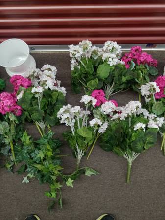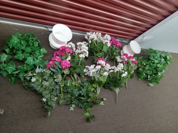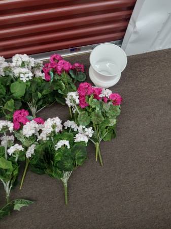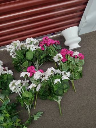 For sale are multiple artificial flowers, ivy,two plastic pots/vases, and a basket. Selling all in picture 1 for $30.00.