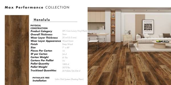 Built with a durable SPC rigid core, attached padding, and a 20 Mil wear layer, Honolulu is engineered for high-traffic use in both residential and commercial settings across Chicago.