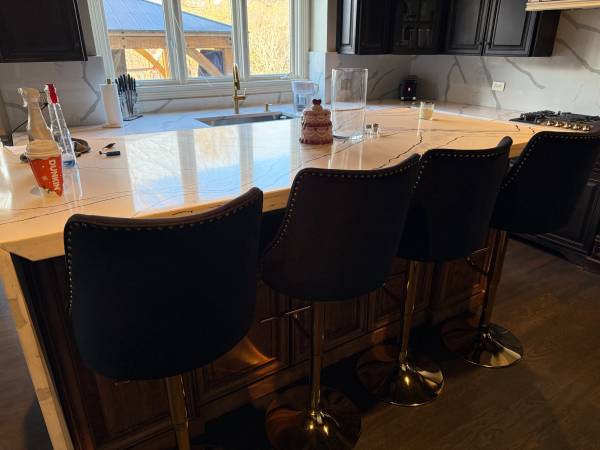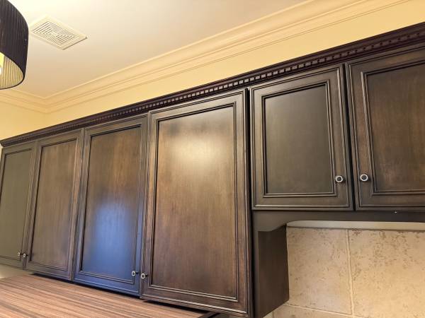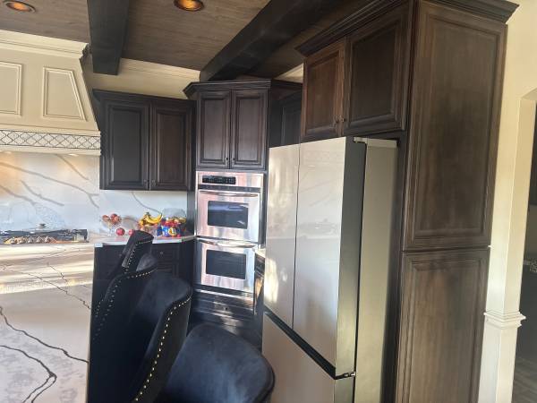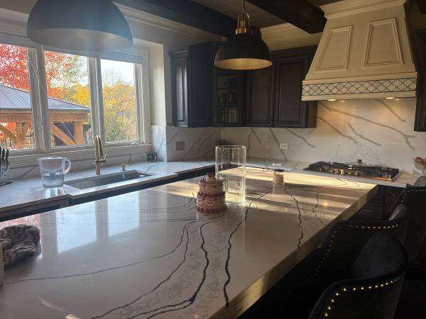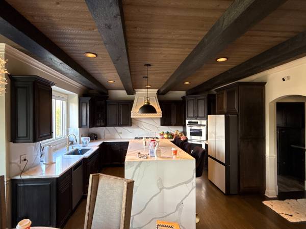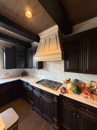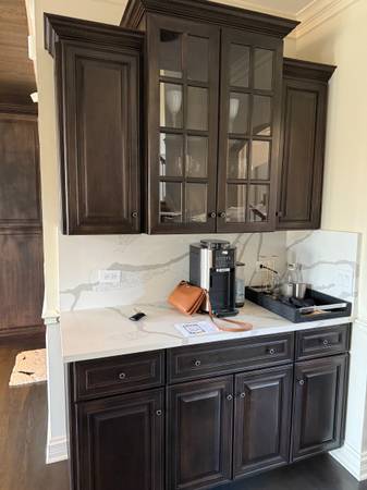This featured kitchen includes custom brown wood kitchen features raised panel full overlay cabinetry accented by incredible quartz waterfall countertops.