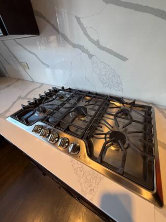 The range hood cover is a contrasting muted white color which creates an elevated, designer look.