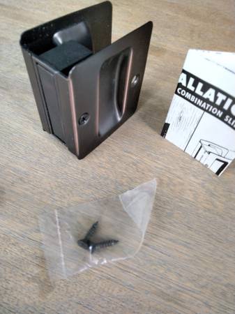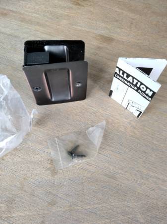 Brand New Oil Rubbed Bronze Pocket door Hardware. This is for a passage door, non-latching. Includes instructions. $10 Call or text Bob: