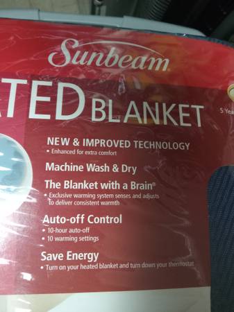 For sale is a blue king size Sunbeam heating blanket. It has never been used, and still in its original package with working condition being confirmed before and during showing. Selling it for $60.00, seeing it sold new for more than $100.00.