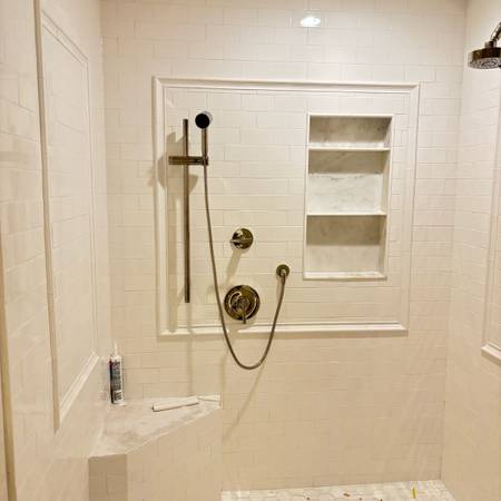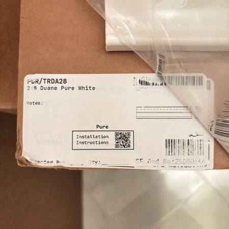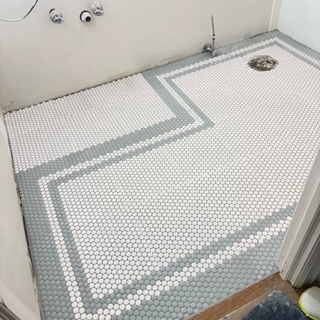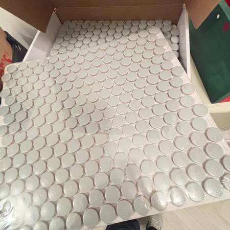 Handmade glazed ceramic tile in 8 inch lengths. Originally $17 per piece. We have 26 feet still sealed on cardboard and covered in plastic originally $700. Beautiful trim pieces used to make a picture frame design in a new shower. This can be used creatively for a kitchen or bath project for an elegant effect. Great buy! Check the pictures for how we used it. Also for sale green penny tile to be used as an accent on a penny floor. Aloe green. Inquire about amount of aloe green, which is a soft green blue. If you purchase this, I will include the grout and a few boxes of subway tile that we have left for free.