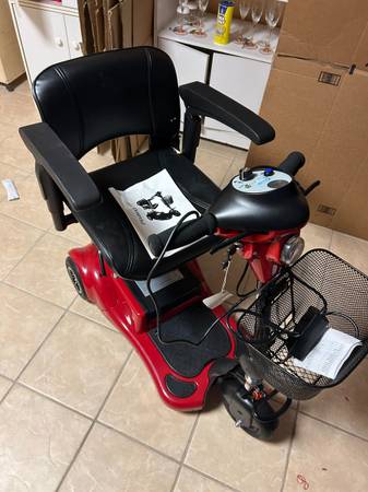 The Mobility Scooter Phantom Compact 3-Wheel Power Scooter gives independence inside and outside the home. Handicapped Scooters have comfortable height adjustable, upgraded seats with flip back, and adjustable width arms. The 3-wheel design of medical scooters allows for a small, 32-inch turning radius. The top speed of the power scooter is 4 mph with a cruising range of 15 miles. Phantom Compact 3 Wheel Power Scooter comes standard with anti-tippers, flat-free tires, a large carry basket, and easy to adjust tiller. Power Scooters can easily remove wireless batteries that can be charged separately from the scooter. The convenient, compact design makes assembly and disassembly of these electric scooters easy. Mobility Scooters are useful for indoor and outdoor use. 3 Wheel Electric Scooter has easy-to-remove batteries, a headlight, and a new finger-pull throttle. Tye Scooter is basically brand new, but because of rare use, it needs a professional technician to tune up to work properly.
