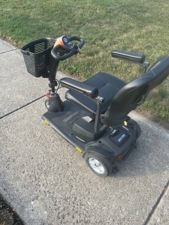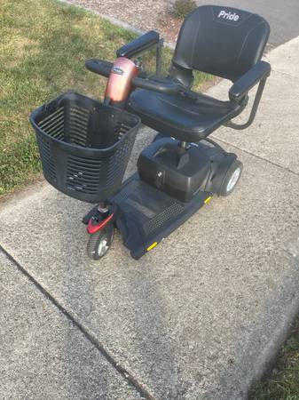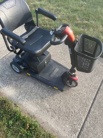 Pride gogo traveler, elite plus mobility scooter. Has black leather seat, two new batteries, charging cable. The front post folds down and the seat removes easily for storage. Runs beautifully.