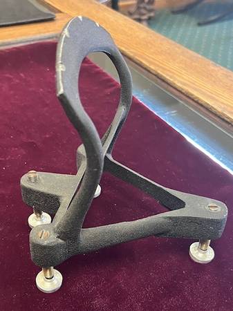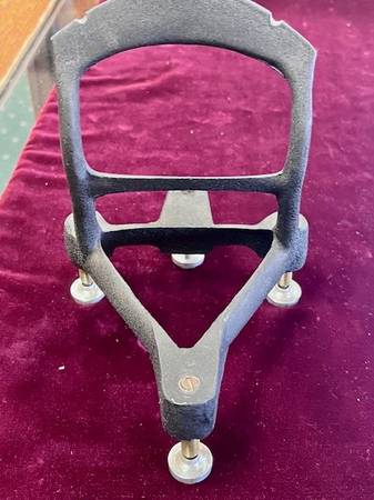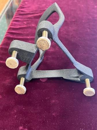 This is a double bass string lifter tool of unknown origin. Constructed of cast aluminum, this lifter is used to maintain string tension and height while fine tuning and adjusting a bass bridge. The lifter body measures approximately 6" by 5" by 6", not including the 4 adjustable cork padded feet. More stable than a modern version, which has two feet compared to this model's 4 feet. A modern version of this tool can sell for $360+ new. We're offering this unique, fully-functional model for $195 plus shipping. No returns.