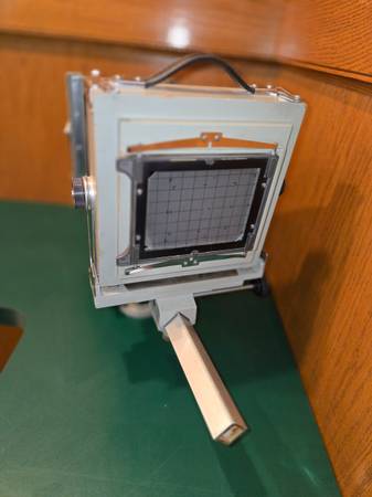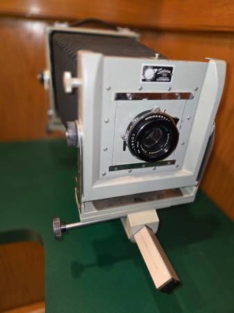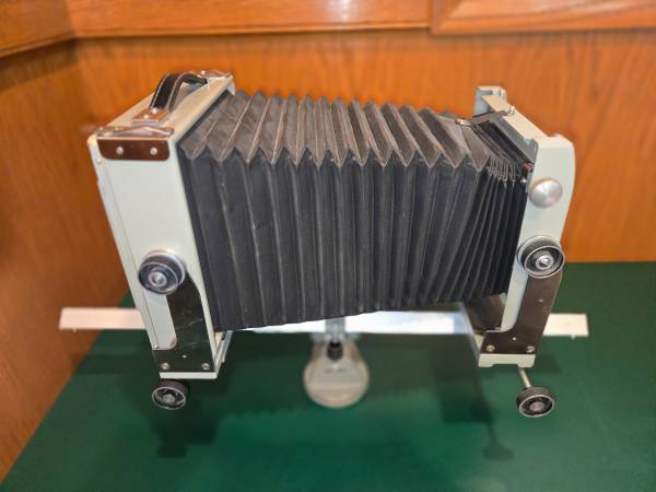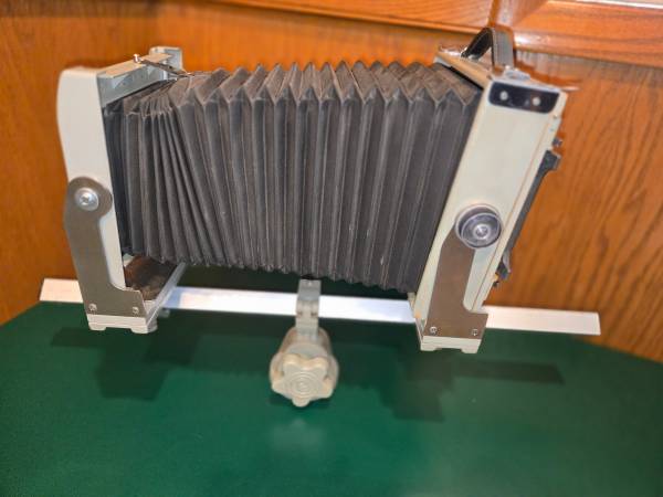 Saturn 75 camera. Lens not included. Works as it should. Front standard has tilt, shift and rise, rear standard has tilt and shift. Both standards can be moved on the rail. Lens board is Copal No. 1.
