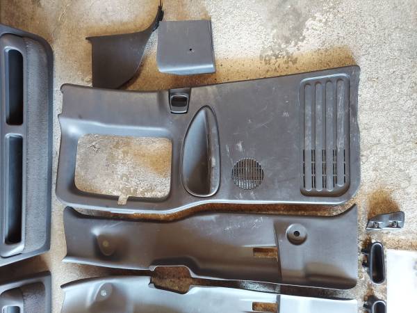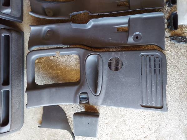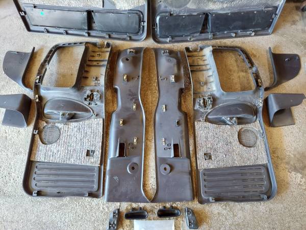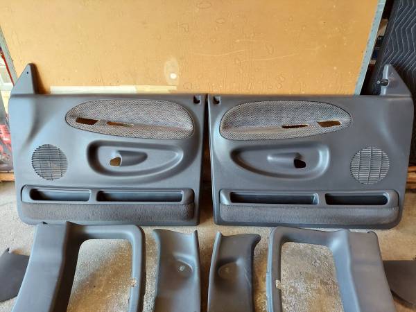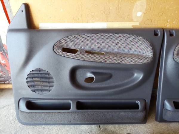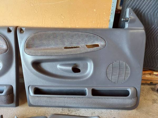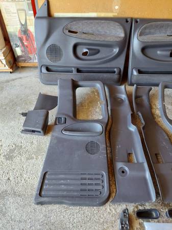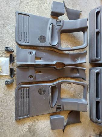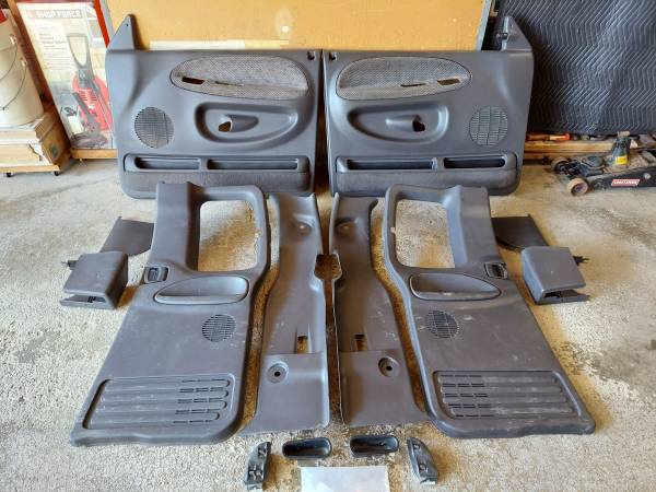 Here's a Set of 1998-02 Dodge Ram or Cummins 1500-3500 interior dark grey door panels for a Quad cab with all push tabs & power door/window switches. Comes complete with kick panels, rear trim panels & seat bracket covers all are Used with a few mounting tabs broken but I have all the push tabs or clips so they can be glued or epoxied. Was going to re-upholster the fabric on armrests so driverside door pull section is detached from door panel. Also have foldup backseat from quad cab for $60. For more info call or text me any day after 8 am & before 10 pm.