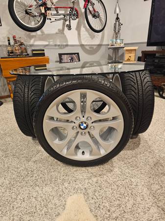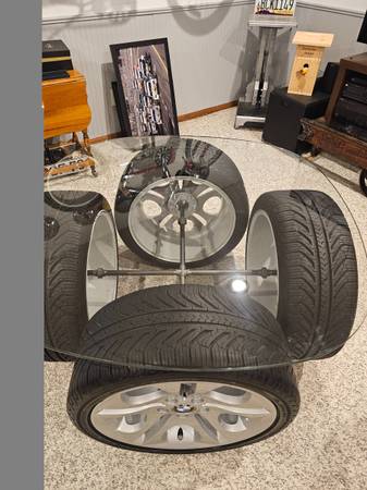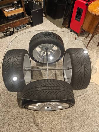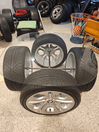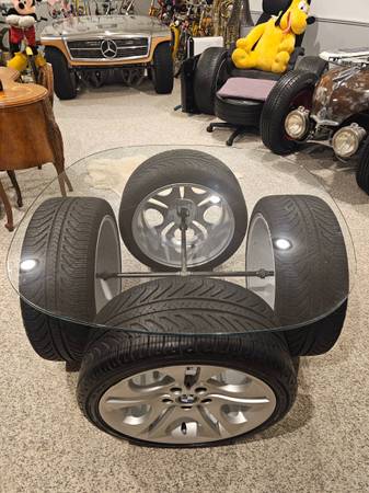 The wheels are from a Z4. The rims and tires have been meticulously cleaned in order that they can be displayed for indoor use as a table. The rims remain unaltered in case the purchaser ever wishes to use them on a car. It features the following: