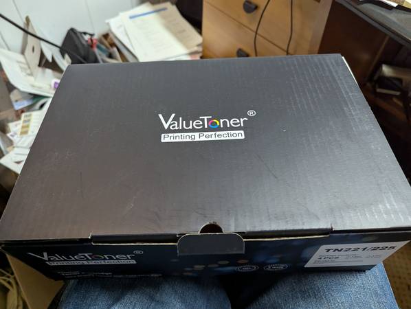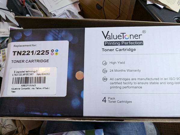 Three boxes of laser ink cartridges, TN225 TN221. Each box has 5 cartridges: 2 black, 1 magenta, 1 yellow, and 1 cyan. Two boxes haven't been opened, 1 box has been opened to check compatibility...
