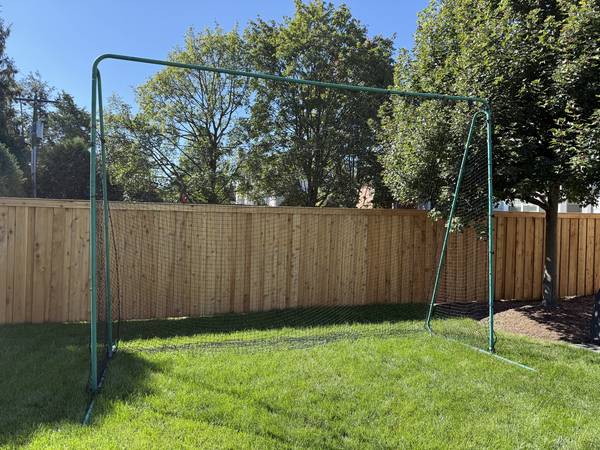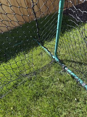 Whether on the field or in the backyard, this backstop is ideal for the player that wants pure shooting practice with tons of reps AND for goalie training. The backstop conveniently snugs up around a lacrosse goal so that you won't have to chase a single ball. As long as you don't need the area behind the net for simulated gameplay, this backstop is perfect for anyone wanting exclusive shooting practice for corners/posts and for developing goalies without fear of searching for missed shots. Also doubles as a soccer goal or a net behind any ball activity to keep from having to chase balls. This frame and net are used and there are 3 holes in bottom corners (soccer ball size holes). Can easily be zip-tied together for quick fix, or, replacement nets are available to purchase online and cost around $65. (**Note last photo is not my backstop- just an image to show sizing and how lax goals fits in front**)