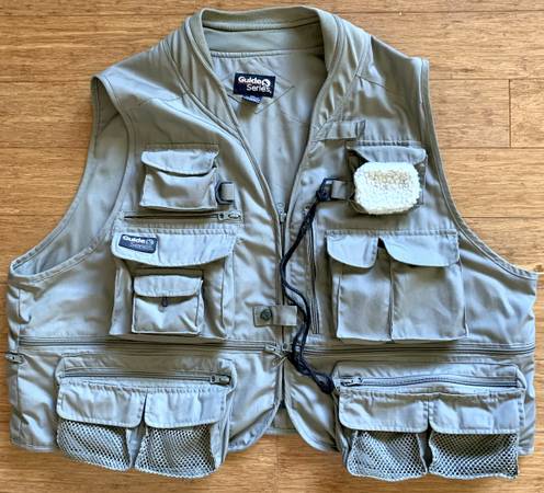 - Men's 2XL Guide Series Fishing Vest - zipper front - 8 zipper compartments 10 velcro closure pockets - 60% cotton, 40% polyester - measurements: 55" Chest (measured at underarms), 23"L