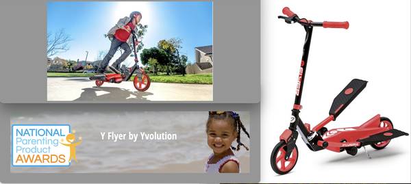 *National Parenting Product Awards Desc: "The all-new Y Flyer is a self-propelling stepper scooter that helps kids stay active while giving them a whole new way to ride as they step up and down on the individual foot plates to achieve an exhilarating speed. The Y Flyer’s foot pedals feature a super grip foot plate for ultimate comfort and traction as they control the scooter’s revolutionary self-propelling stepping action. Just step, go and prepare for extreme fun."