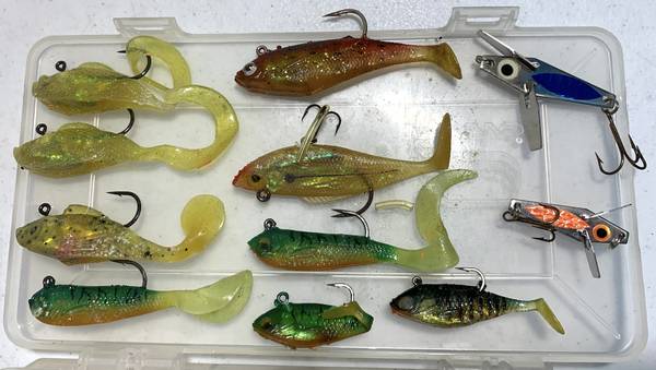 - approx 45 (1"-3") pre-rigged Lures (some are twirl tail) - see photos