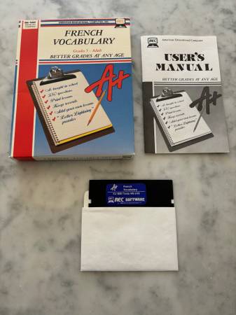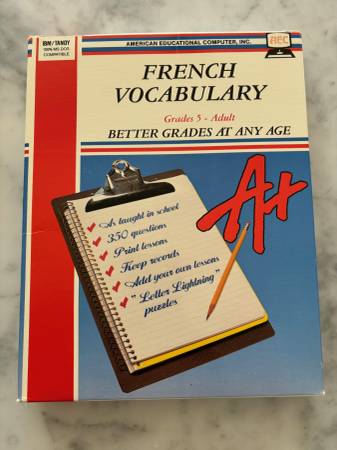 A+ French Vocabulary vintage computer software for sale. Computer software is compatible with IBM, Tandy and MS DOS and includes one (1) 5.25" floppy disk. Original box and user’s manual included.