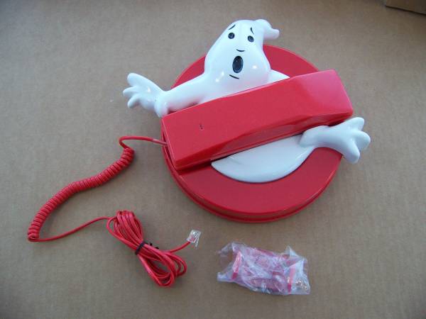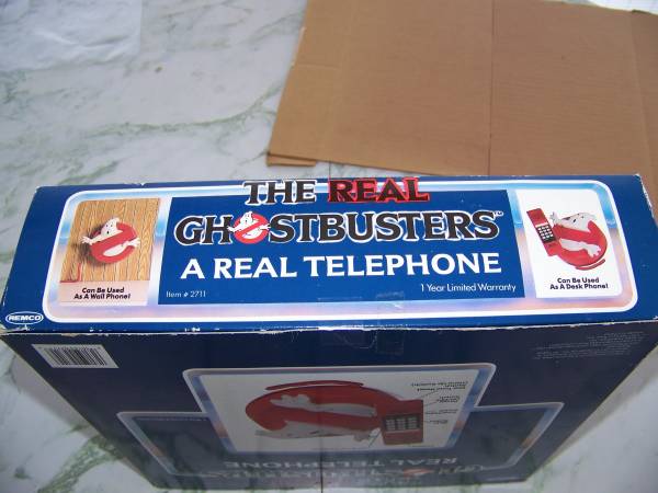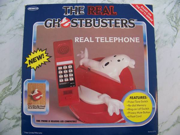 Like New Complete Ghost Busters Telephone with box. The Remco 1987 The Real Ghostbusters Phone is a vintage action figure from the Ghostbusters franchise. It also includes the optional wall mount. Made of plastic and manufactured in 1987, this rare and highly sought-after collectible features a Ghost character from the classic Ghostbusters movie. With its original design and branding by Remco, this vintage piece is a must-have for fans of the 1980s nostalgia and collectors of vintage action figures. This unique item is a true gem for any Ghostbusters enthusiast looking to add a piece of retro pop culture to their collection. It is a real working telephone in excellent like new condition. Box as shown in picture. A great addition to any collection. Please call Rich or Barb at show contact info