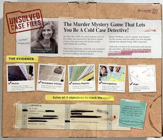 - Includes over 50 evidence photos & documents for you to investigate including newspaper articles, crime scene photographs, evidence report, phone records, coroners report, fingerprint card, map of the crime scene, legal documents, suspect interrogations, witness statements, character photographs and much more. Everything about this mystery game is fiction, but will feel just like you are a real cold-case detective.