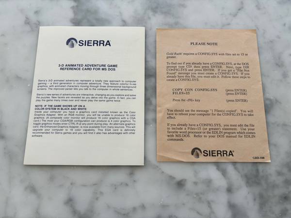 I am selling a vintage Sierra Gold Rush computer game. Computer game is compatible with IBM, Tandy and MS-DOS and includes both 3.5” and 5.25" disks. Original box and user’s manual are included.