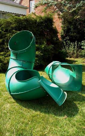 Big 2 piece plastic pipe green tube child slide. I think this was designed for a fun child slide...use for other creative applications too. Largest piece measures aprox 78" length x 51" deep x 44" height. Smaller piece measures aprox 59" length x 26" deep x 28" height. You will need a large vehilce to transport. Pick up from Villa Park. Please call or text show contact info