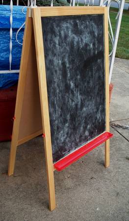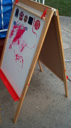 Self standing 3 In 1 kids pine wood easel. Great for art work. Dual-sided. Blackboard chalk board, white board & paper roll to roll down fresh paper (paper not included) for lots of art work paintings. Red color chalk holder. IKEA MALA model 304.889.66. Measures aprox 24 1/2" length x 18" deep when open x 44" height. Stickers and paint on this item as pictured. With some clean up it will look great. These are about $100 in the store. Pick up from Villa Park. Please call or text show contact info