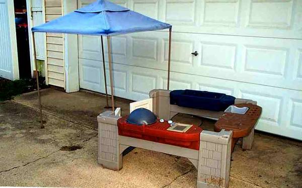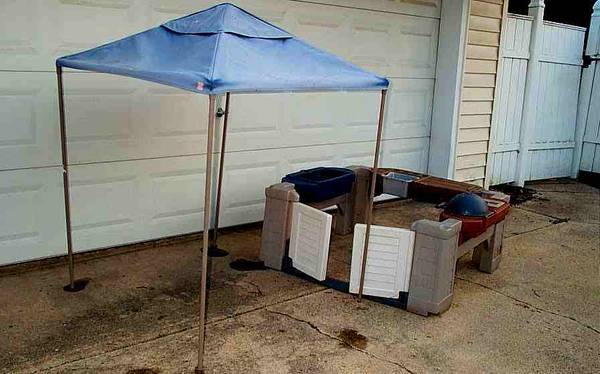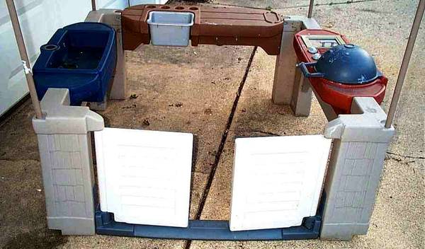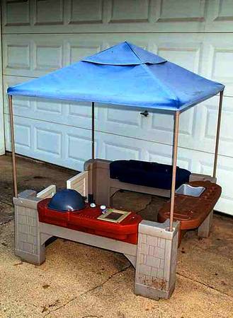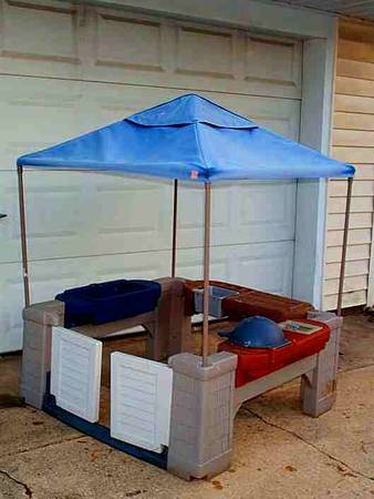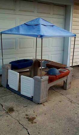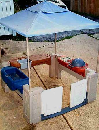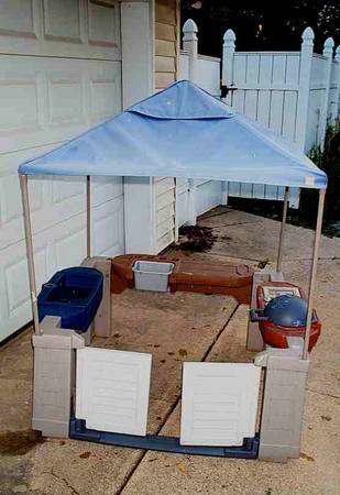 Big "Step 2" outdoor child yard play house. Complete with faux stove BBQ cooker, sink and swinging hinged entrance doors. Features a tent style canopy. Canopy removes for easier transport. Item measures aprox 50" length x 53 1/2" deep x 60" height with canpoy and 24" height without canopy. You will need a fairly large vehicle for transport so please observe measurements. Pick up from Villa Park, Illinois. Please call or text show contact info