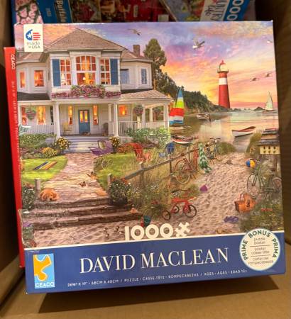 1000 piece puzzle $5 each. Pick up in Wheaton Rockefeller Christmas Bottle Caps Wine Country Balloon Valley Main St France Springbok By the Pond Country Life Thomas Kinkade Beach House Hot Air...
