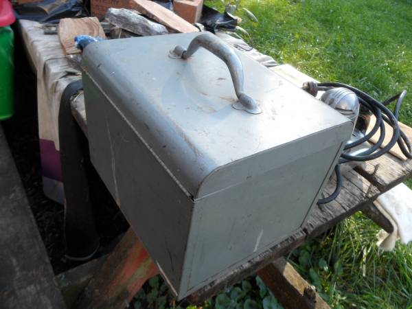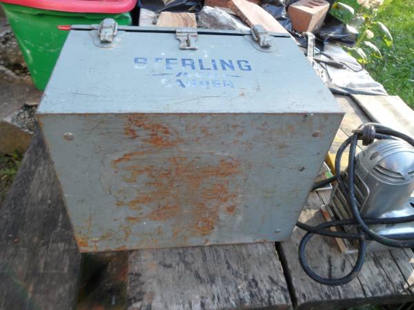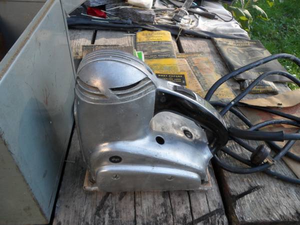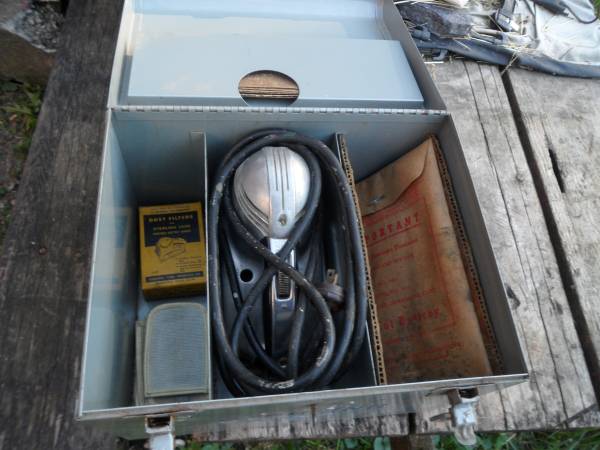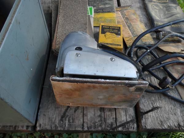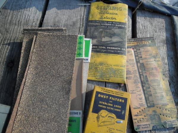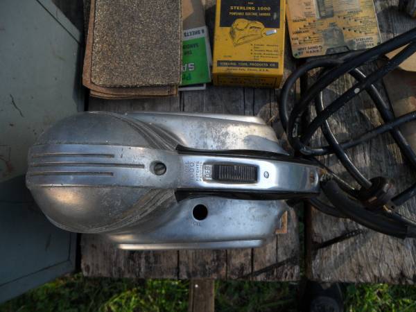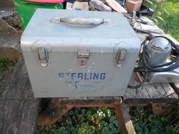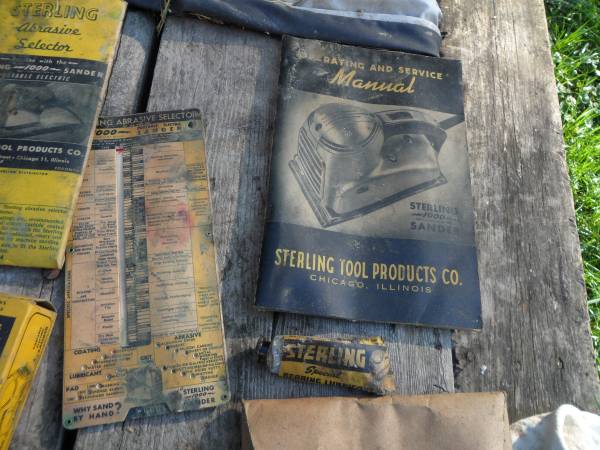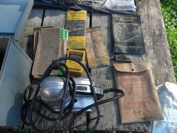 This is a vintage (the booklet says 1945) Sterling 1000 electric sander in the original metal carry case. Comes with operating manual (it is covered in oil and some pages are stuck together), a tube of bearing lubricant, abrasive selector card, box of original Sterling dust filters, and several sanding pads. Sander works like new and has been tested (cord needs some repairs). Carry case is in very good condition and measures 9" tall x 12 3/4" long x 10" wide. Please send number along with any questions you may have and I'll get back to you as soon as I can