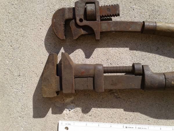 2 Old wrenches 1 monkey wrench good condition for its age. 1 pipe wrench has a cracked handle. See pics for condition both very old $45 OBO Cash only no trades. Thanks for looking.