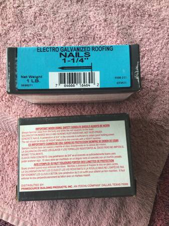 7). Two boxes, one unopened/sealed, Grip-Rite Fas’ners Electro Galvanized Roofing Nails 1-1/4” stainless steel approx. 202 per pound.