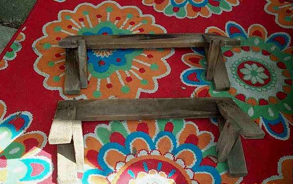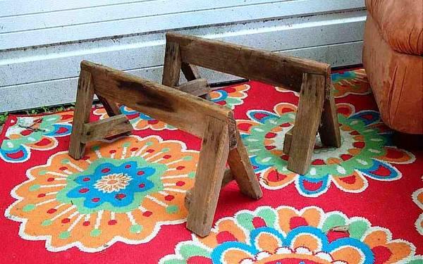 Unique compact size saw horses. Their small size makes for easy storage. Great for raising and cutting wood. These saw horses look custom made and are strong. Each measures aprox 23 1/2" length x 8" deep x 11" height. Pick up from North Aurora. Please call or text show contact info