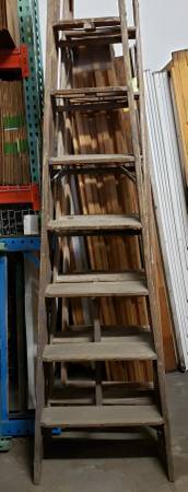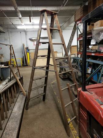 8 ft Wood A Frame Ladder Heavy Duty Industrial Very Good Solid Condition Made in USA Industrial Treasures 1501 Indiana Avenue, Unit 1A St. Charles, IL 60174 www.industrial-treasures.com