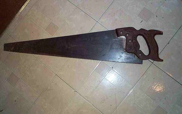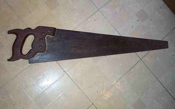 Antique work shop long hand saw. Beautiful carved wheat motif wood handle. Looks to be a Disston & Sons brand. Made in U.S.A. The number 10 stamped on the blade. Used condition. Blade is still useable to cut. Measures aprox 29" length x 6" height. Nice addition to a vintage style work shop. These vintage saws are getting hard to find. This one is about 100 years old. Pick up from Villa Park, Illinois. Please call or text show contact info