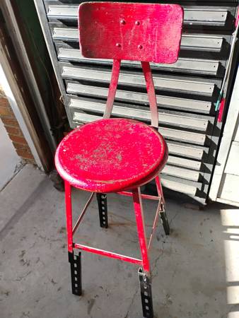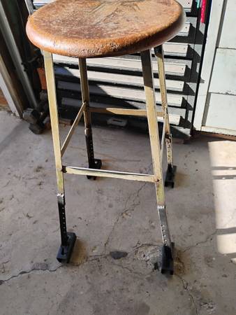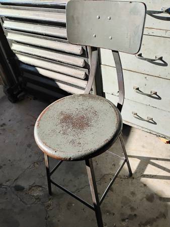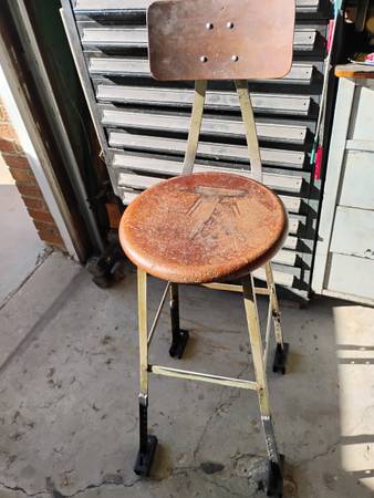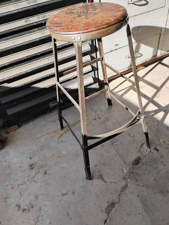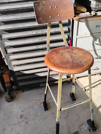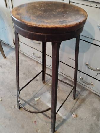 vintage metal and wood Pollard Bros. shop stools with backs $65 and up.