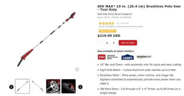 This pole saw is Toro's latest and greatest. It is contractor quality. It is the best and strongest pole saw that Toro makes. Lithium battery power is endless. Get 80 cuts on one battery charge! Sells for $299.00 at Home Depot plus sales tax of $26.16, totaling $325.16. Why pay high, full retail price? Get it from me on the cheap. I also have many different new Toro 60-volt lithium batteries and new Flex-Force 60-volt tools available. Just ask.