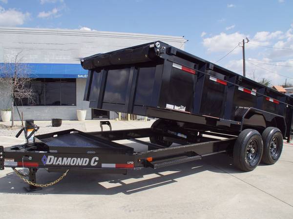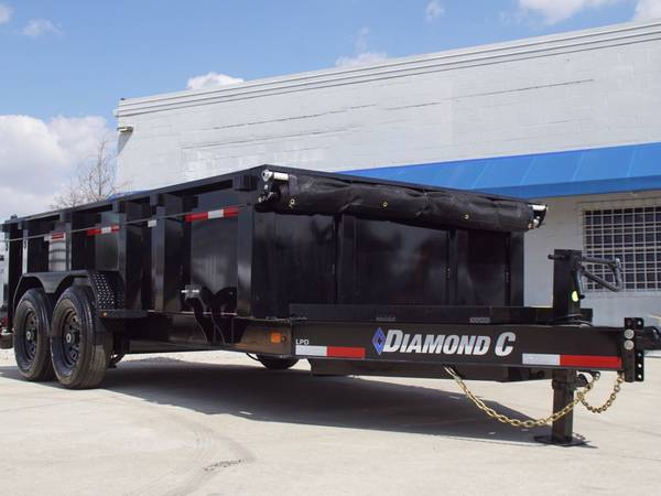 2022 Diamond C 14-foot low-profile dump trailer. Rated at 14,900 GVWR. Strong build, easy to use. Has 32-inch tall sides and a tarp kit.