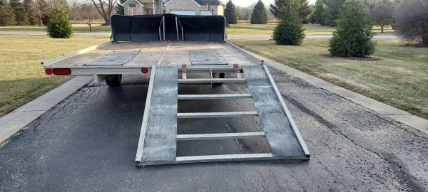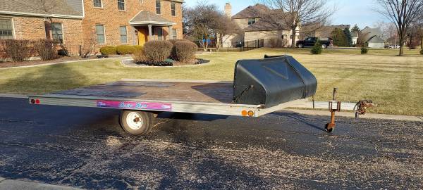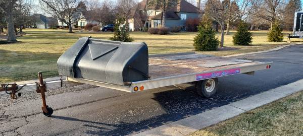 1995 3-Place SledBed all aluminum snowmobile trailer with salt shield. When full loaded, 2 snowmobiles forward facing, 1 snowmobile rear facing. Includes rear load, front unload (either side) ramp which stows in the back under the bed. Also have 3 tie down bars and 2 spare tire rims (one of which has a good tire). 8' wide by 12' long with 2' v-nose to front unload. Cash only! IF THE AD IS STILL UP, THE ITEM IS STILL AVAILABLE.