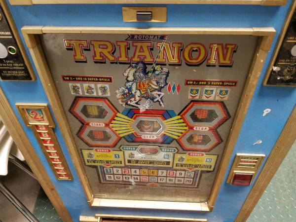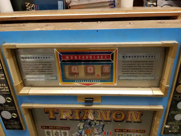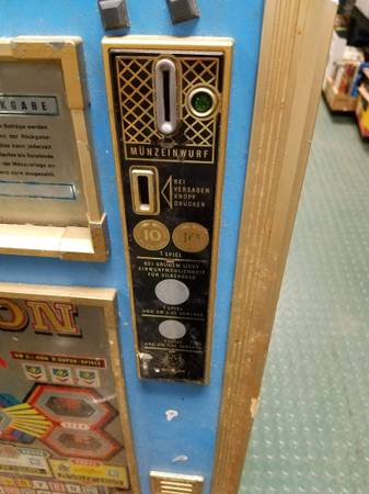 We re the only one to have this very colorful machine. It came into our possession about 10 years go. Not sure if it works cause wiring is for Europe/UK or Germany. So I believe it will need an adapter to change the current to accommodate 120v. Client that brought it in got it from a lady who said it did work. Item was photographed when we received it and then shrink wrapped which it still is propped in a corner on a pallet safely tucked away. Wheter it works or not is is a great mancave display item that is loaded with colors. Very heavy. Asking $395