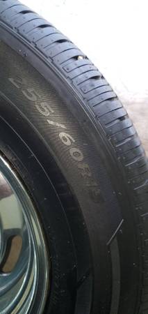 These came with a truck I recently bought - I wanted something different and don't need them. Clean, no rust on any of the wheels or hub caps & no plugs in the tires. Tires hold air and have decent tread. Front wheels are 5 bolt pattern, tires are 205/70R15. Rear wheels are universal fit, tires are 255/50R15.