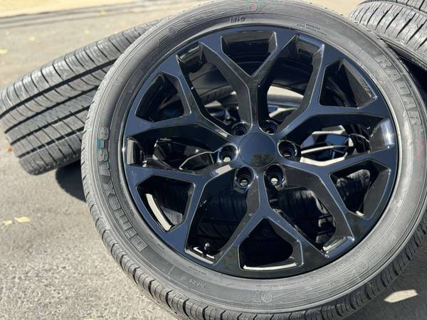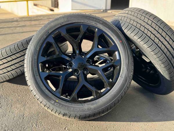 Set of 4 Wheels and Tires, NEW 22” Wheels for Chevy and GMC Trucks and SUVs GMC style Denali Black finish wrapped in New tires size 285/45R22 All Season tire.